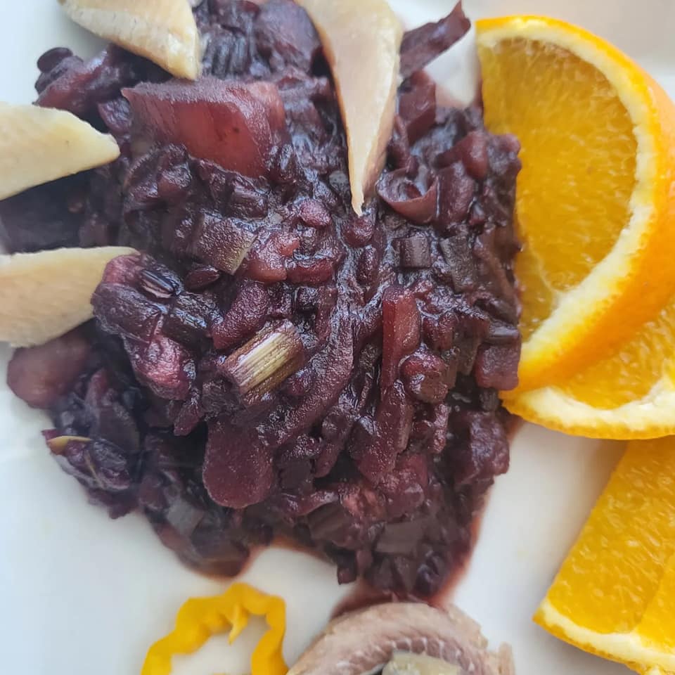 Pomme de terre rouge,poireau,banane plantain,habanero servi avec du Hareng fumé et des quartiers d’orange givrées…..un bouquet de saveurs![]()