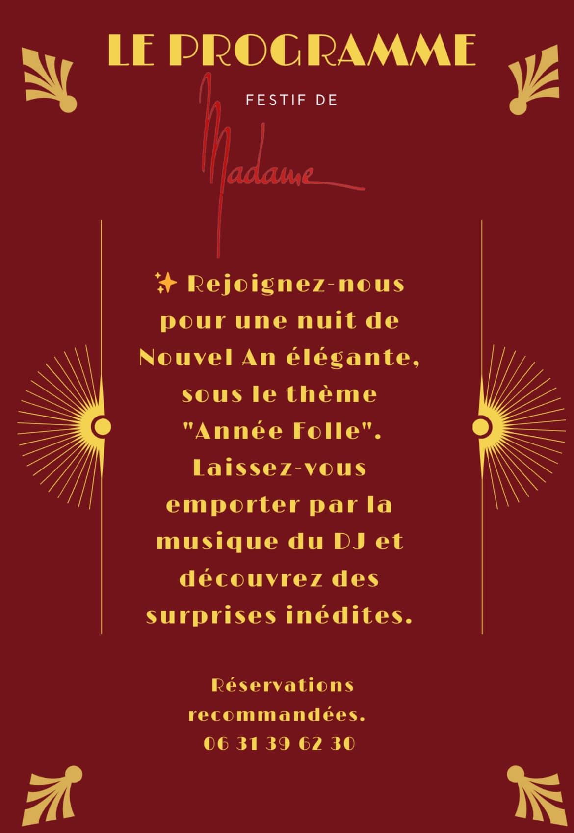 Rejoignez MADAME et son équipe pour une soirée de folie en compagnie De Gatby le magnifique..