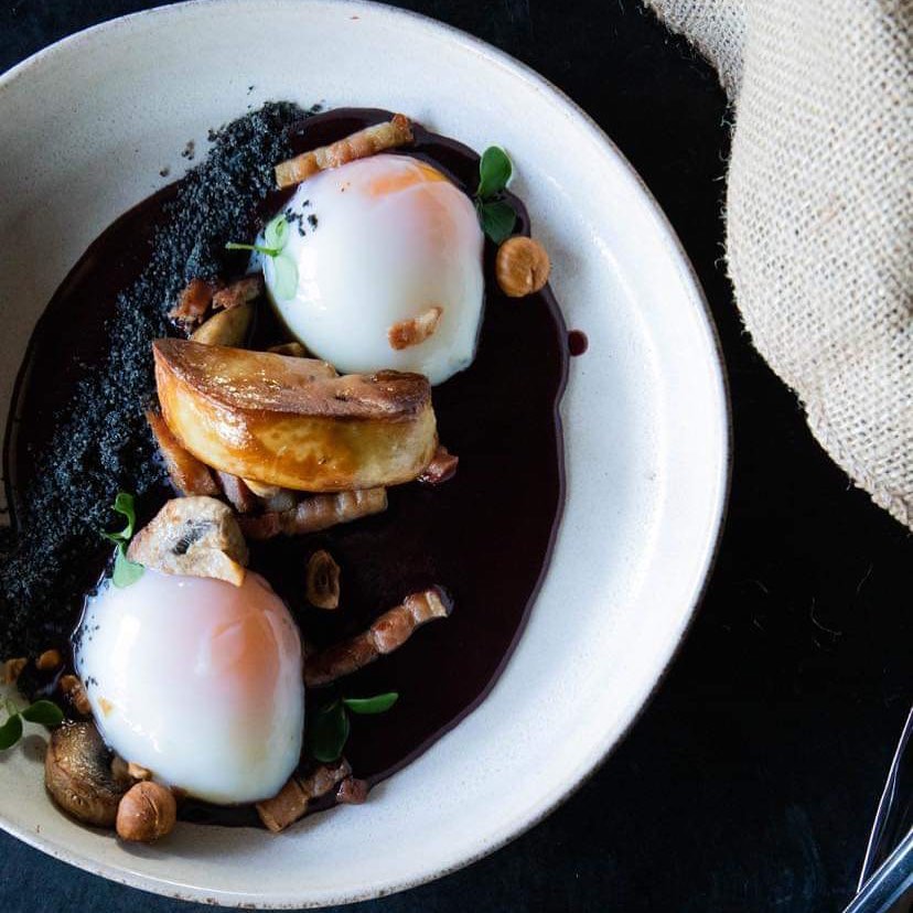 Oeufs parfaits, jus de treille réduit bourguignon, « terre comestible » (crumble d’encre de seiche)