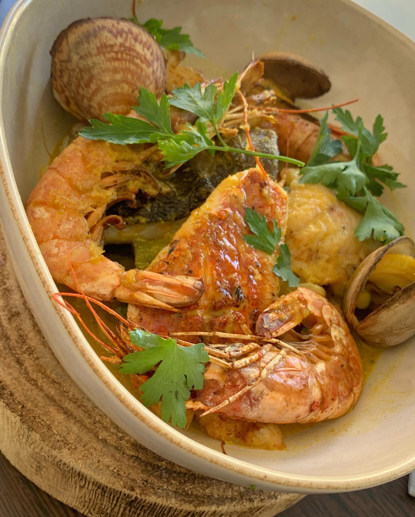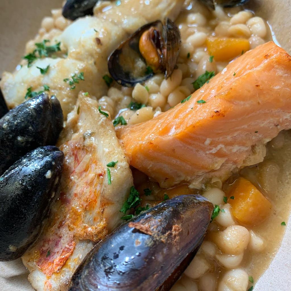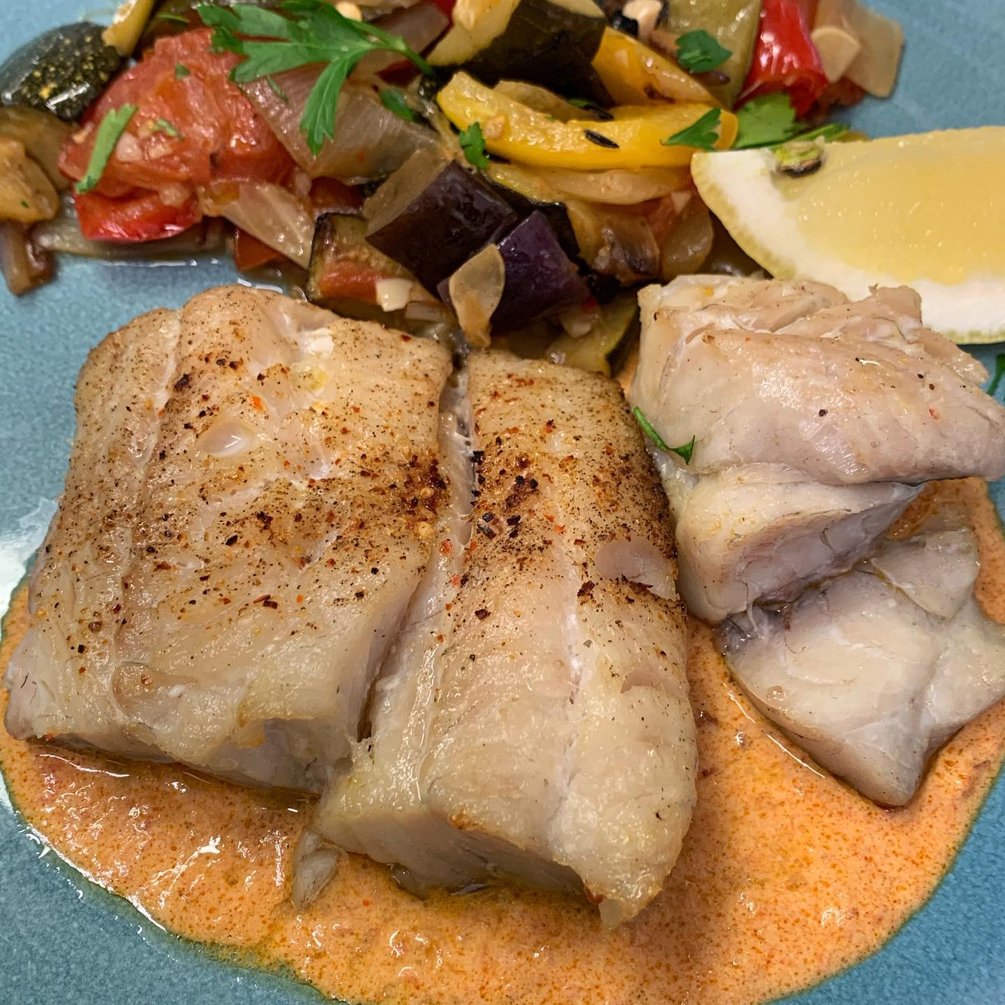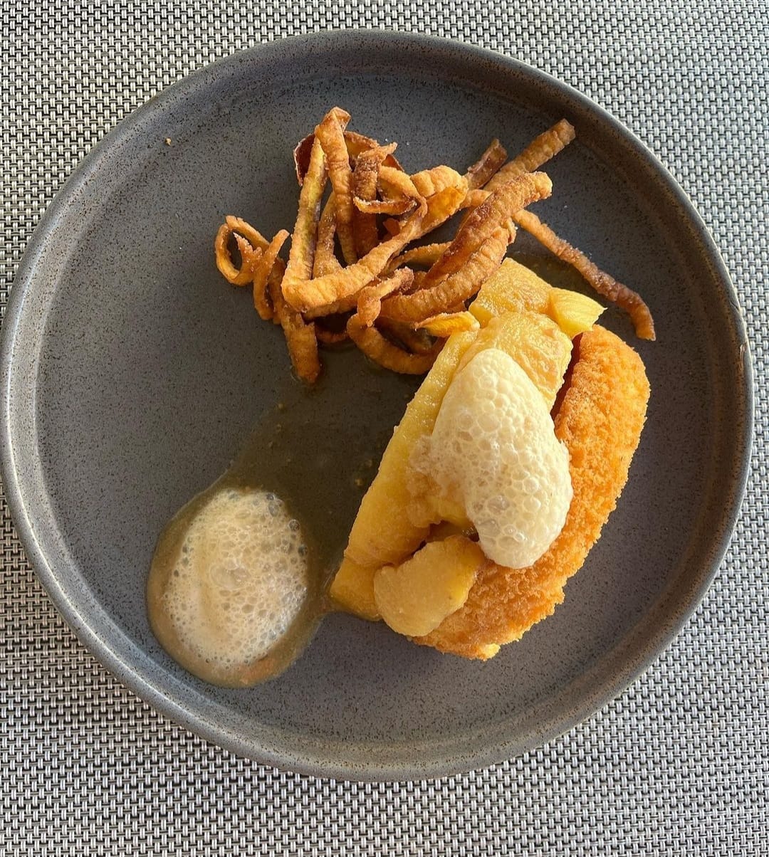 Pain brioché curry-curcuma ; ketchup de piquillos ; brebis ; chorizo et filet de Dorade Sébaste – accompagné de nos wedges au paprika