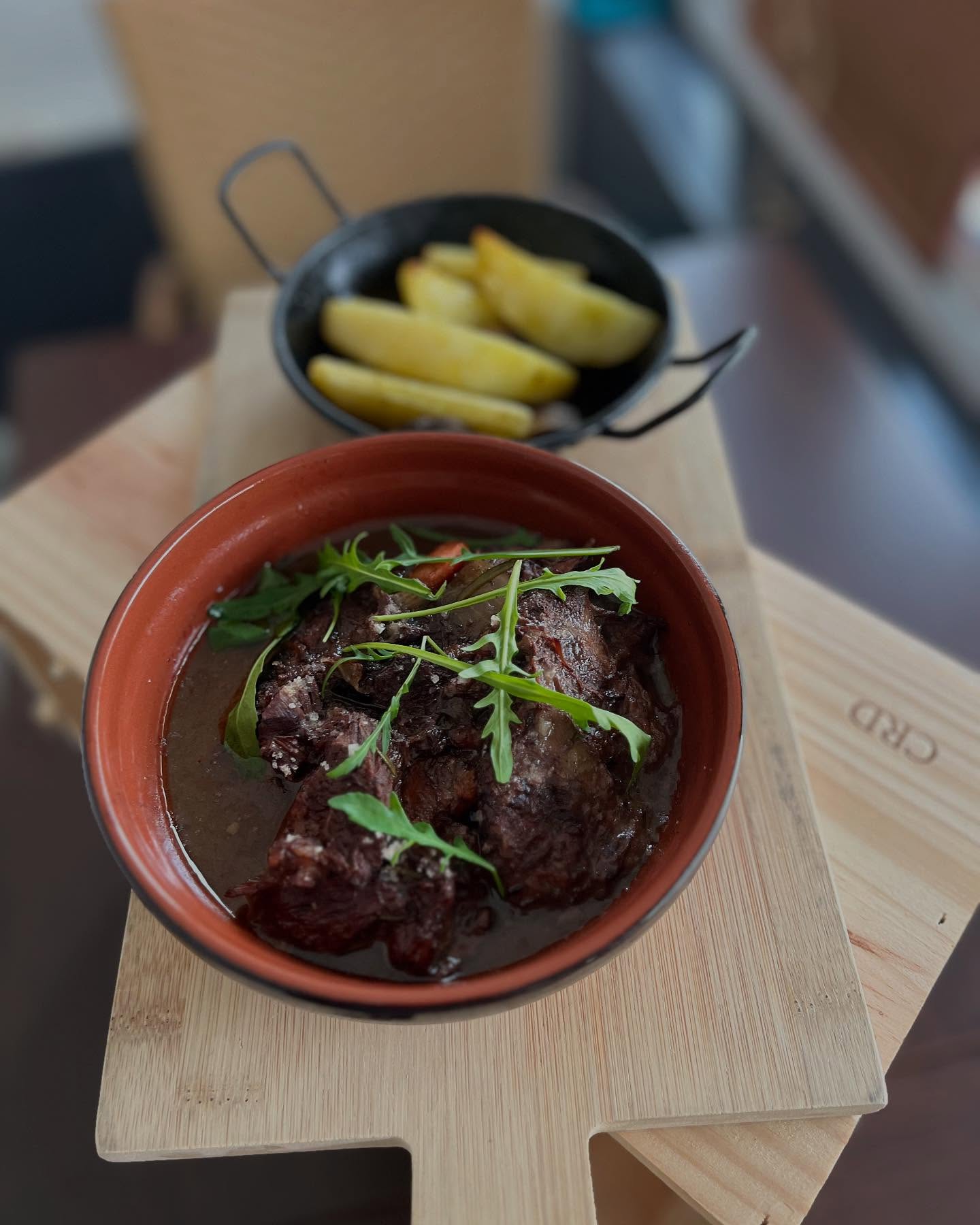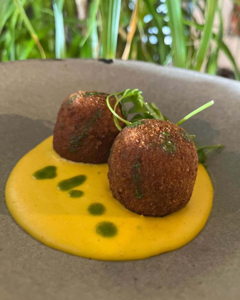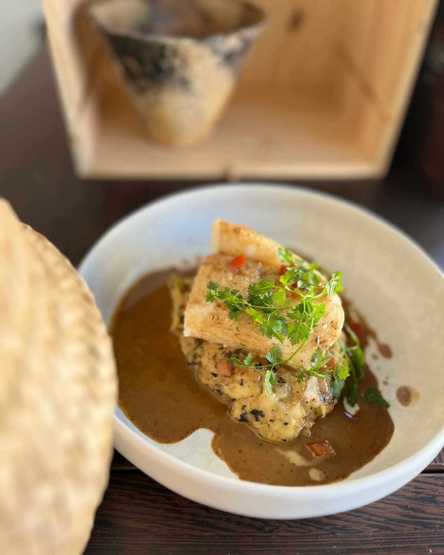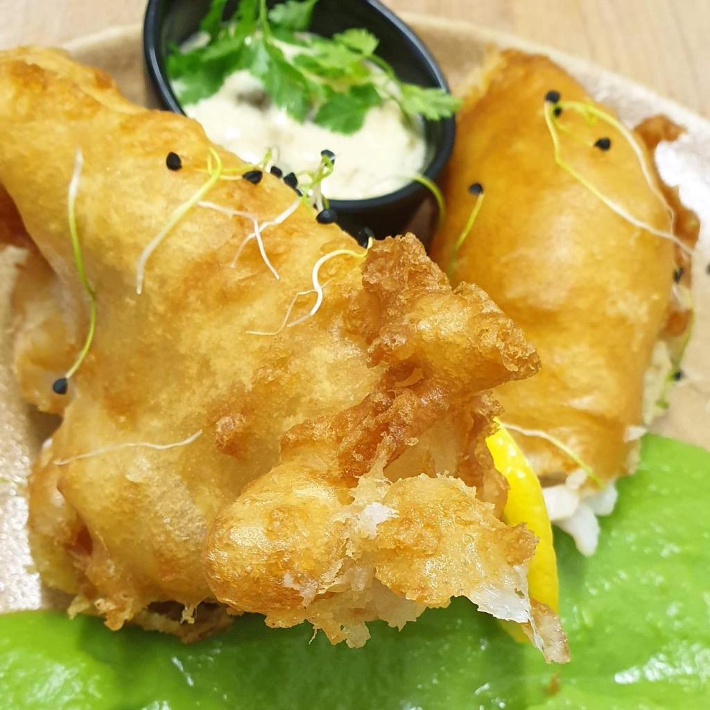 Pain brioché curry-curcuma ; ketchup de piquillos ; brebis ; chorizo et filet de Dorade Sébaste – accompagné de nos wedges au paprika