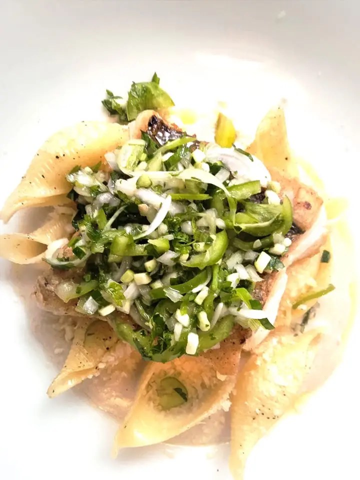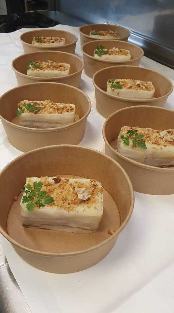Effeuillé de cabillaud ciboulette , pomme de terre écrasée et coulis de piquillos – 15 €