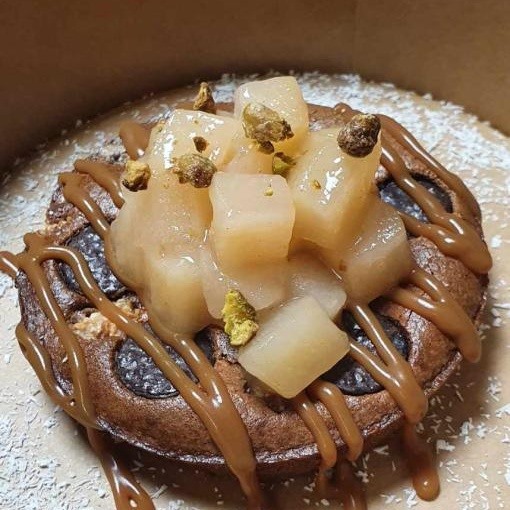 Clafoutis cacao « Bounty », poires pochées au « 4 épices », caramel tendre au beurre salé…