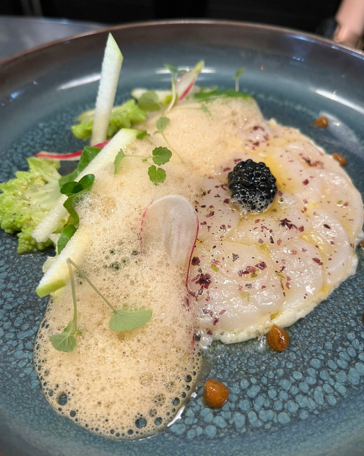 Cabillaud Skrei et poulpe mariné au curry Polenta crémeuse, condiment aux olives .