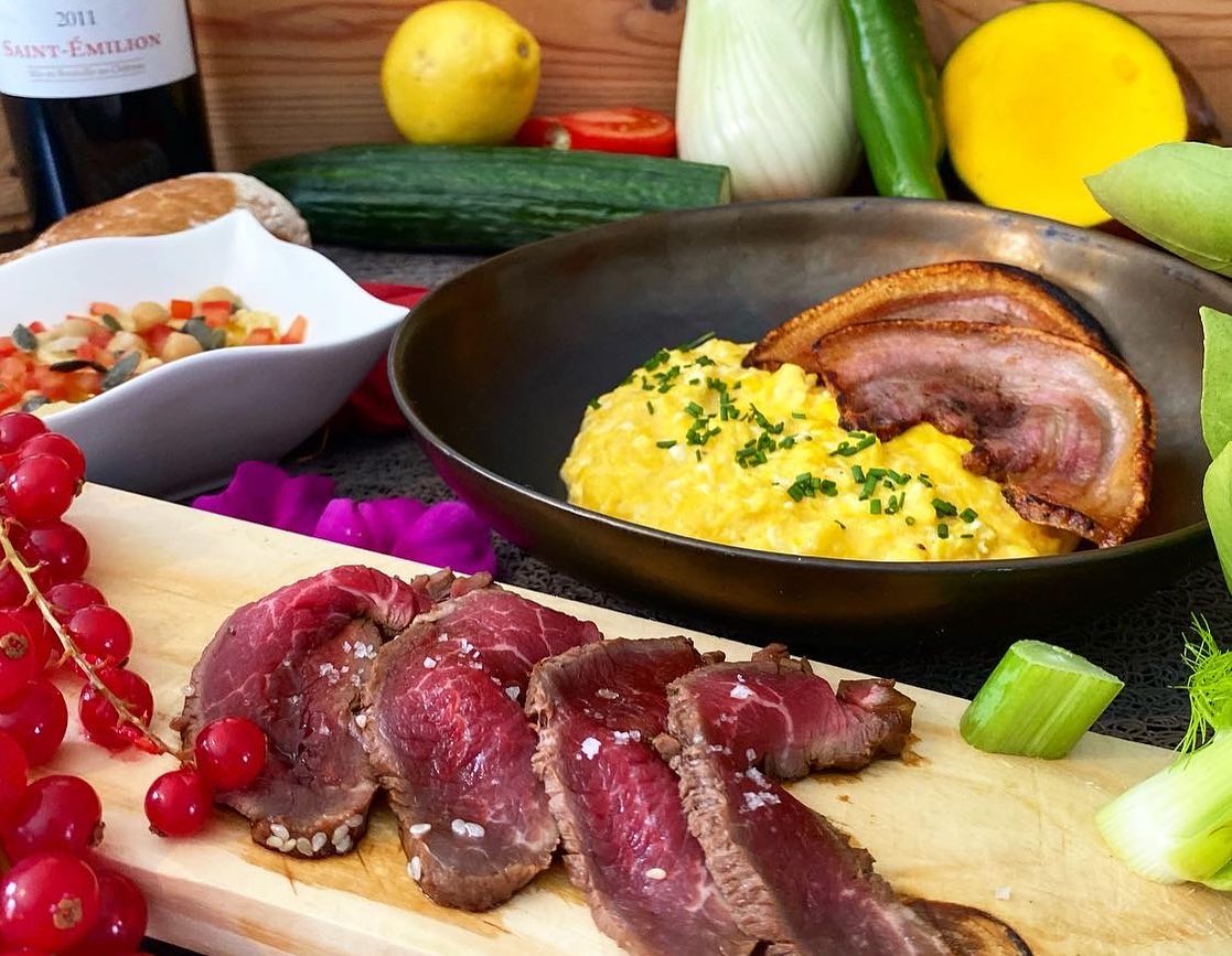 Œufs brouillés et lard du pays![]()