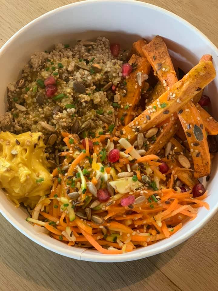 LA SALADE VEGETARIENNE : Envie d’une salade végétarienne ce week-end : patates douces rôties, tofu au curcuma, quinoa, crudités, vinaigrette à la mangue, grenade, graines …