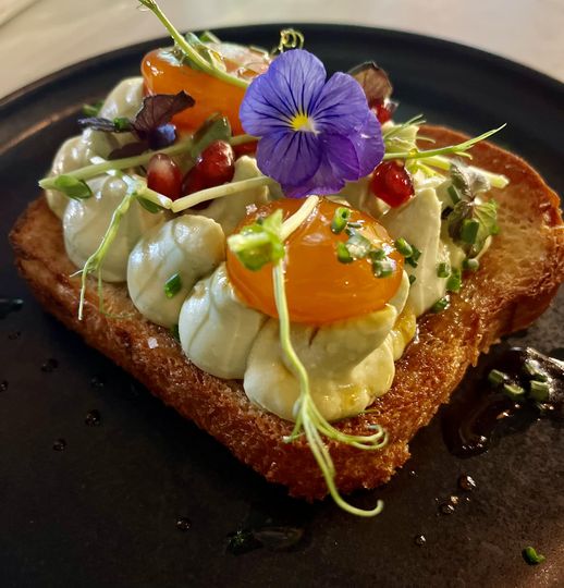 Brioche, crème d’avocat citronnée à l’ail, jaune d’œuf confit au soja ![]()