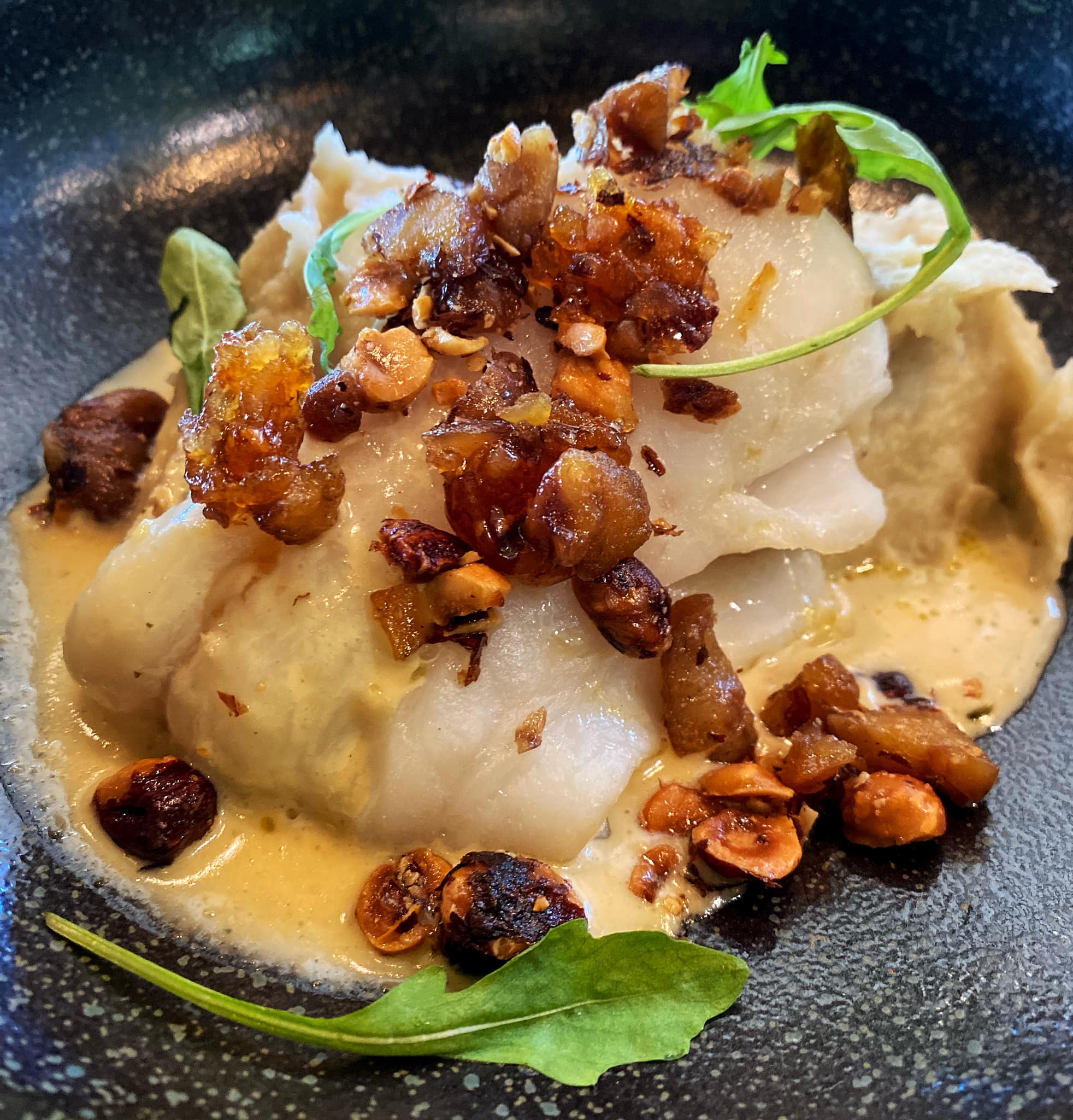 – pave de cabillaud, sauce noilly, purée de p.de T et panais, nougatine de châtaignes et noisettes