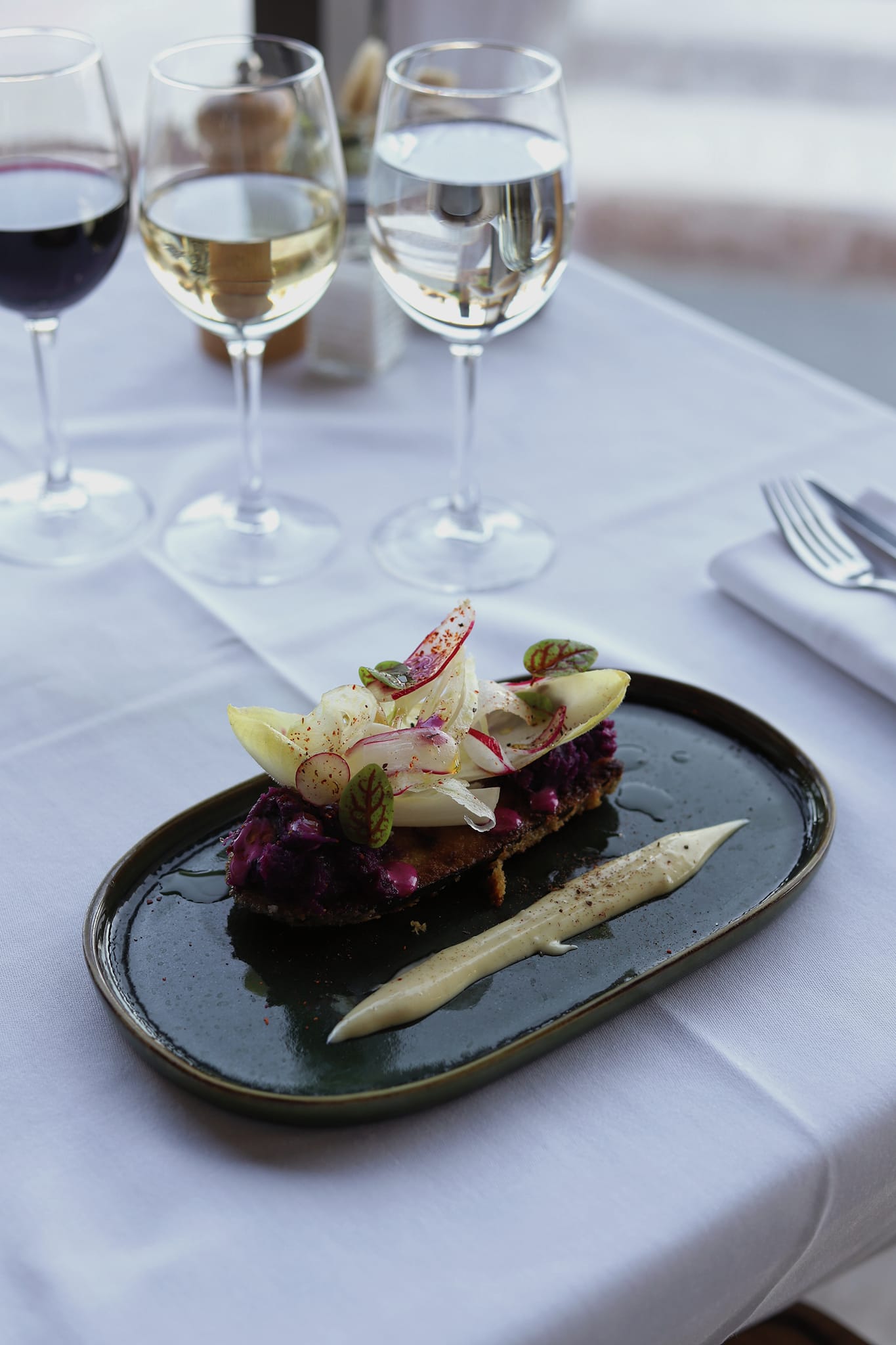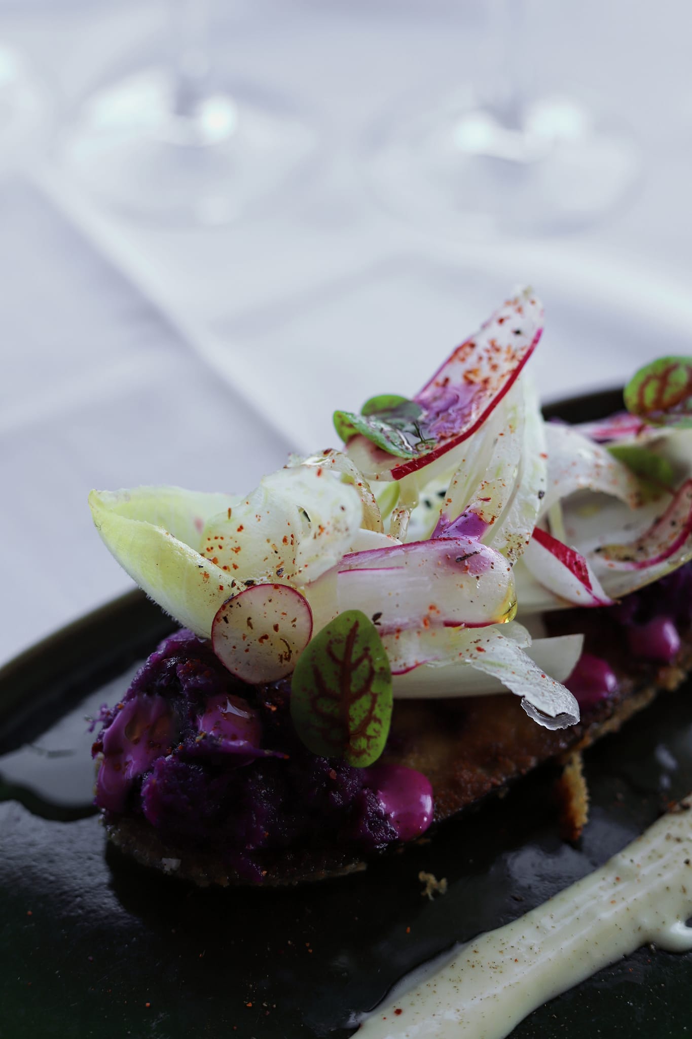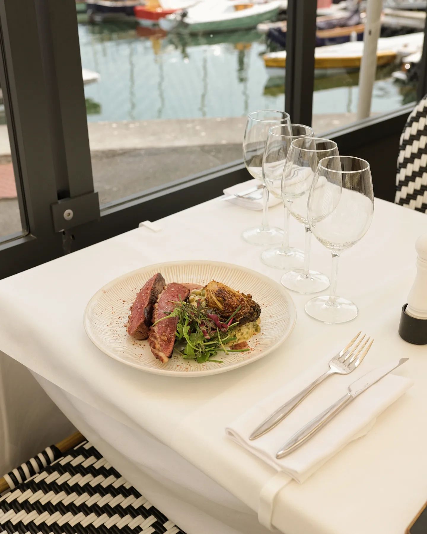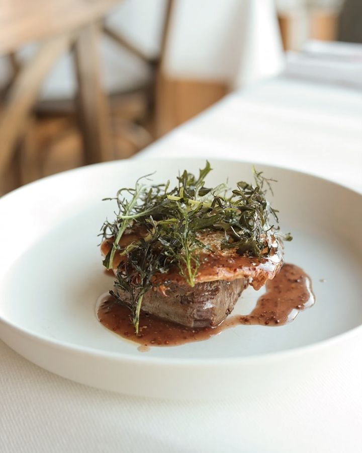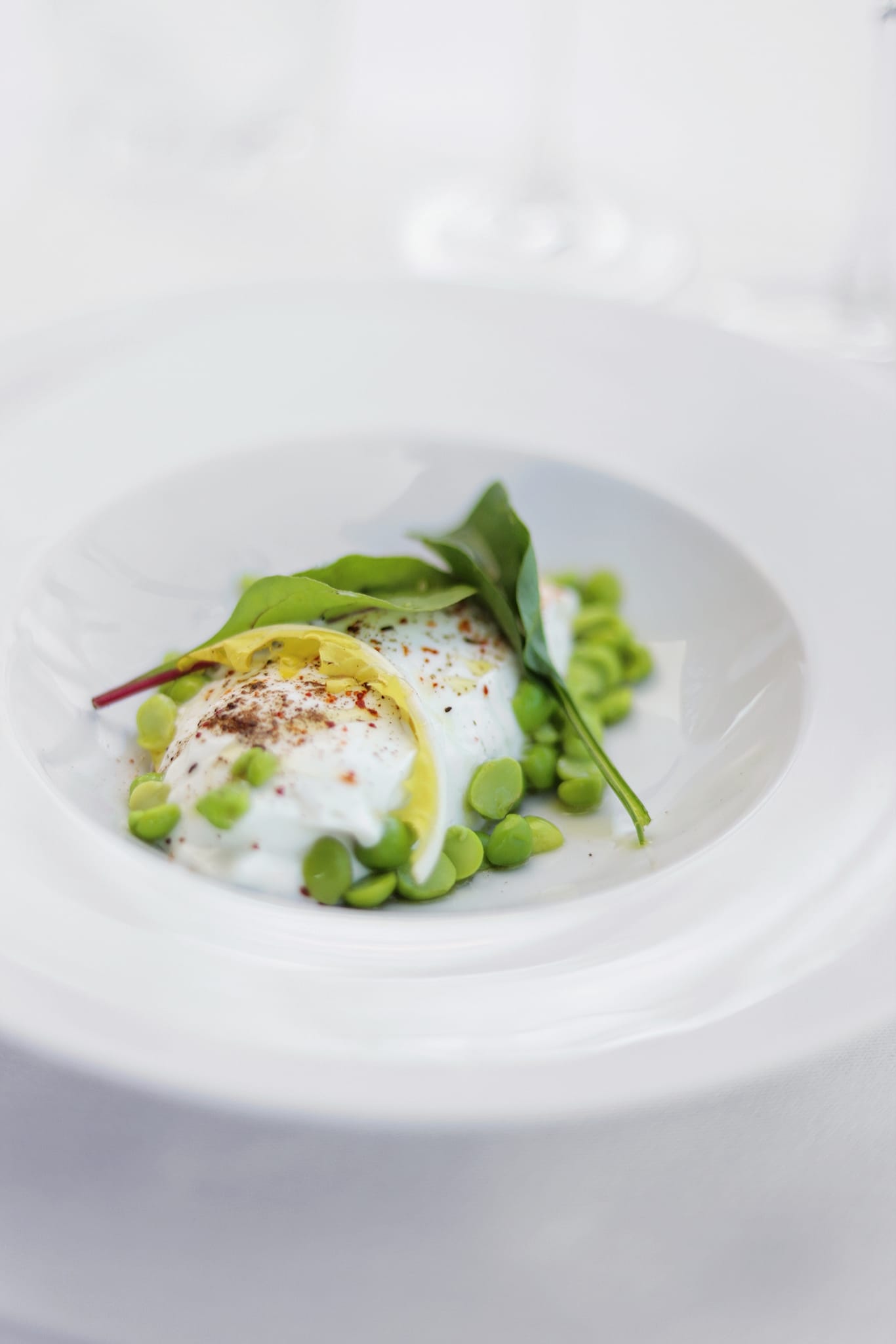 Parmi les entrées proposées, voici le Merenda d’aubergine panée / la Raviole ouverte de Tourteau, bouillon d’étrille, citronnelle et citron vert. / le Merlu de ligne et vierge de chanterelle. / le Veau et sarriette, aubergines cuites à la plancha et jus de veau.