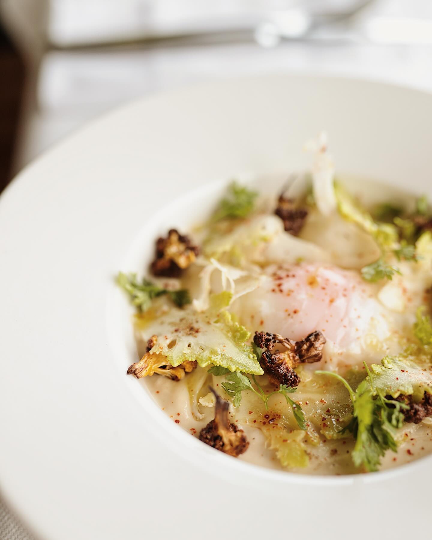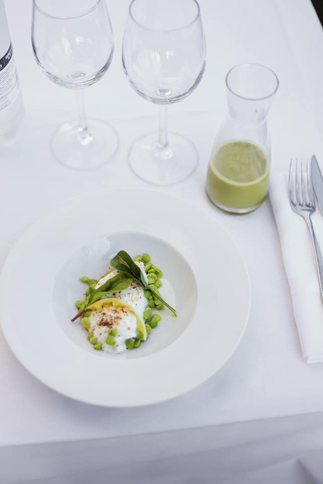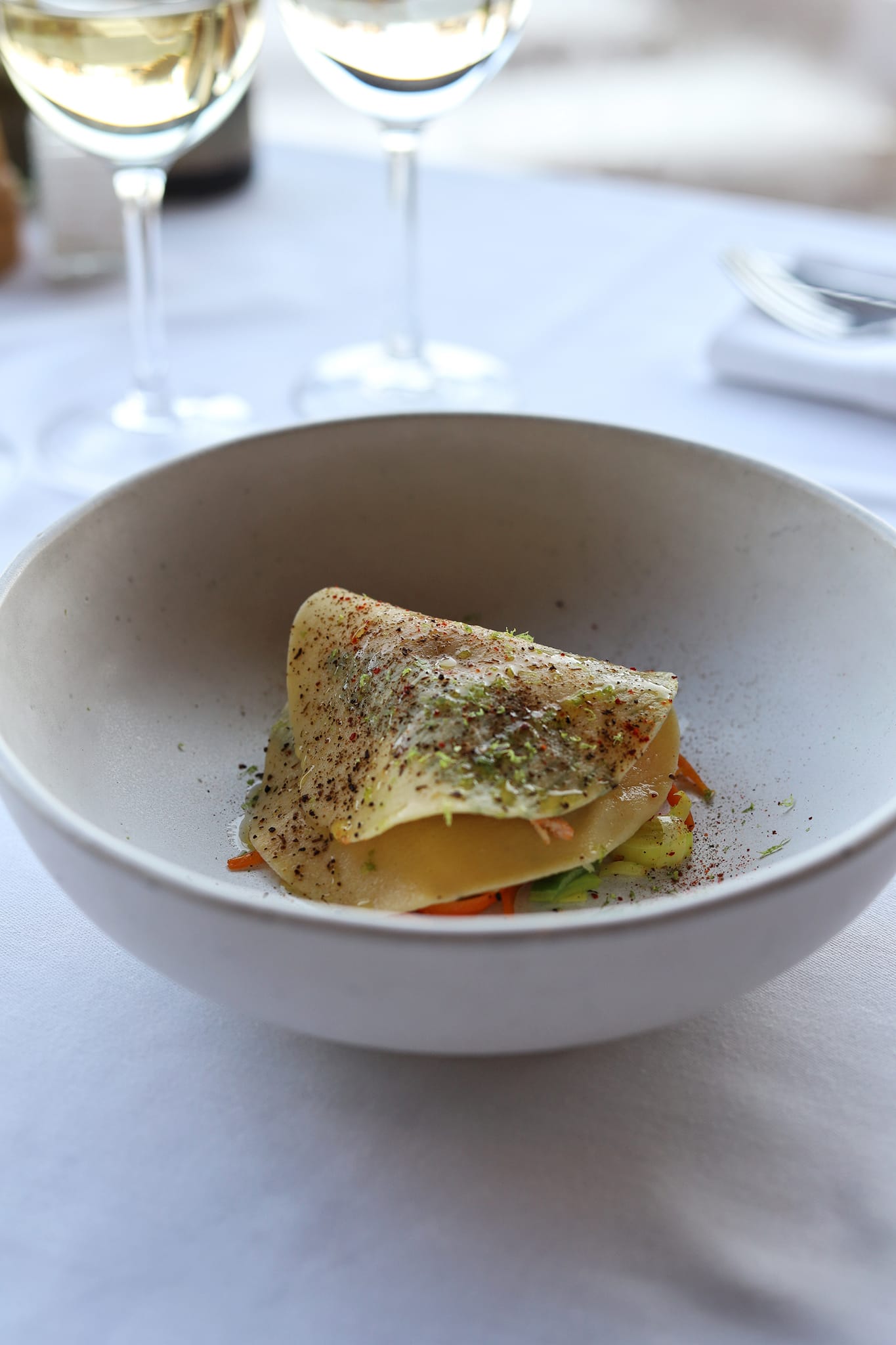 “Poisson du moment, tombée de chou vert et shiitake, fumé de poissons à la citronnelle”