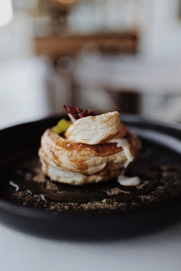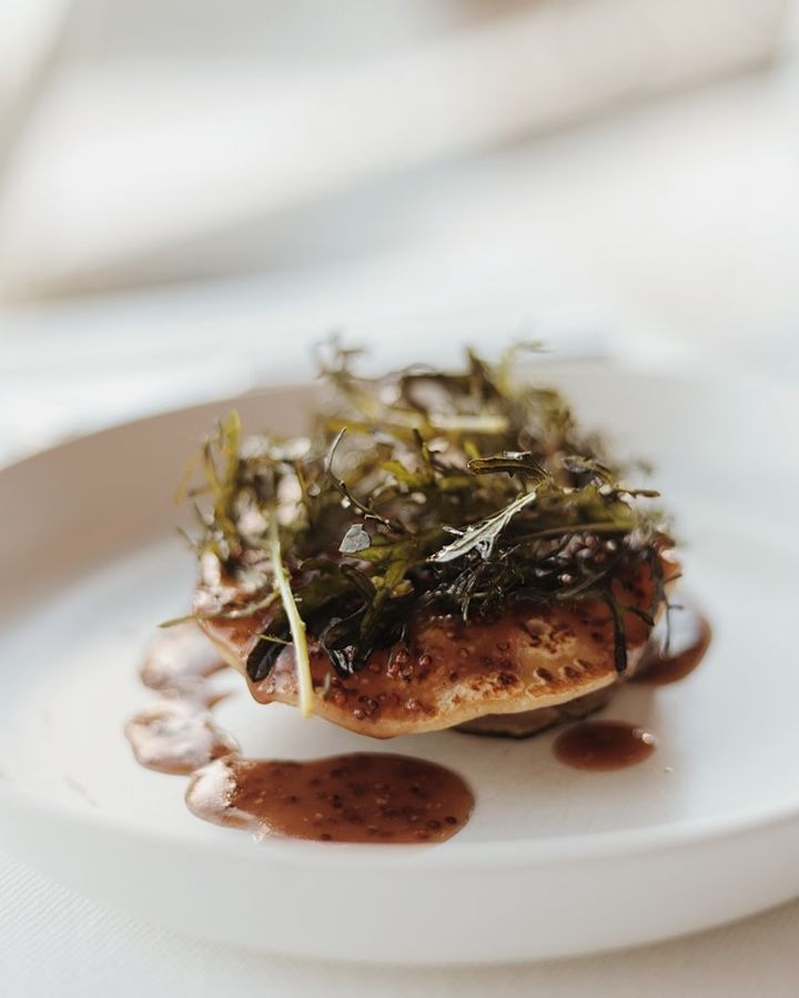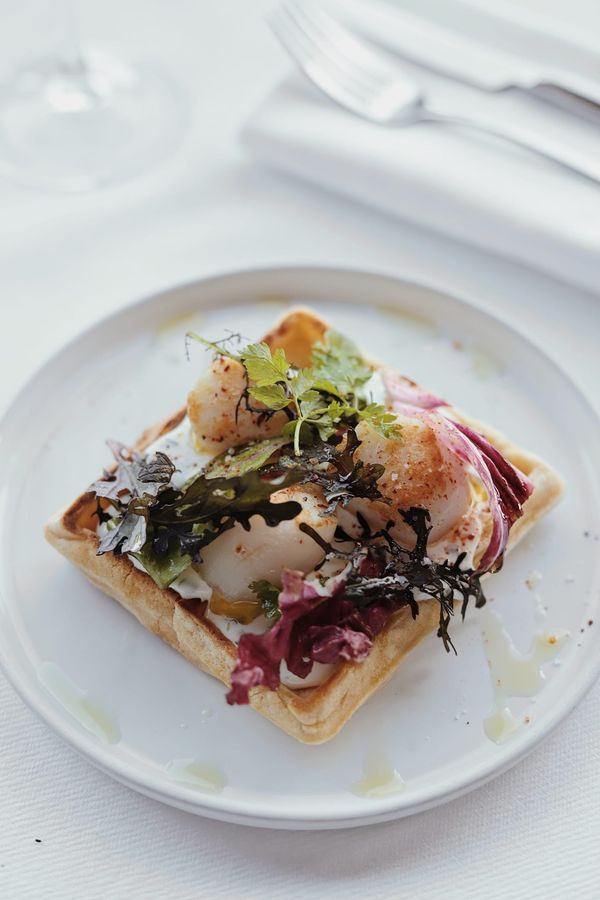 Première découverte de la nouvelle carte, il s’agit d’une entrée ! Notre chef vous propose sa gaufrette revisitée en version salée, accompagnée de Saint-Jacques et de sa crème de truffe