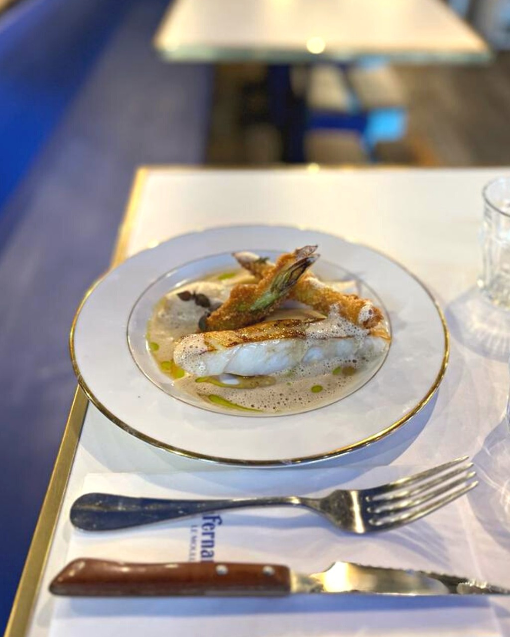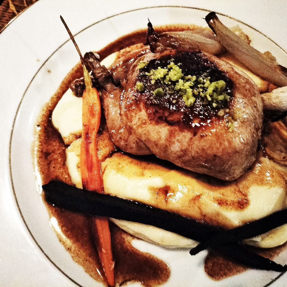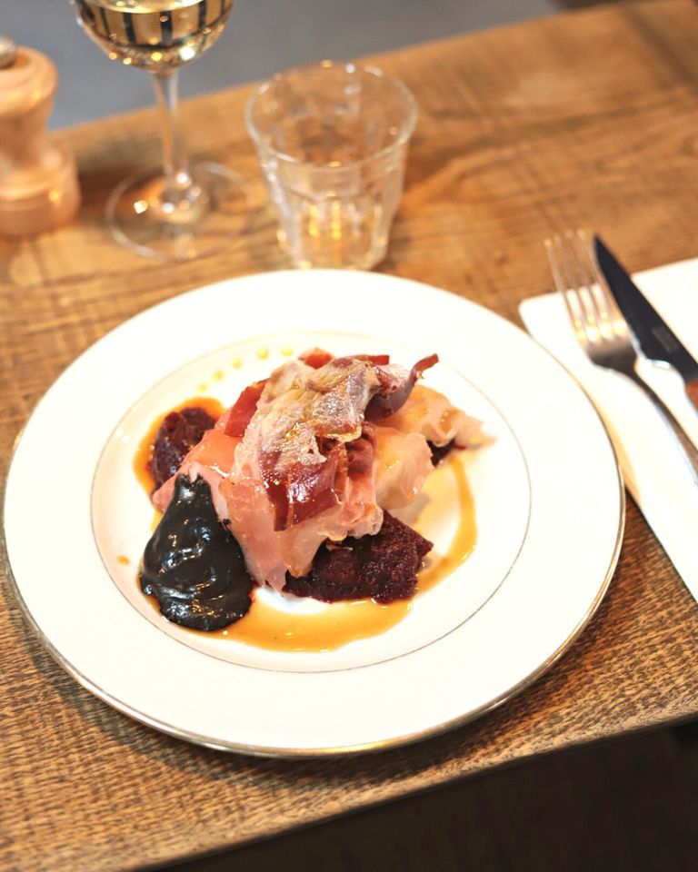 • Lieu jaune, lard de colonnata, mousseline topinambour, émulsion café, jus de veau