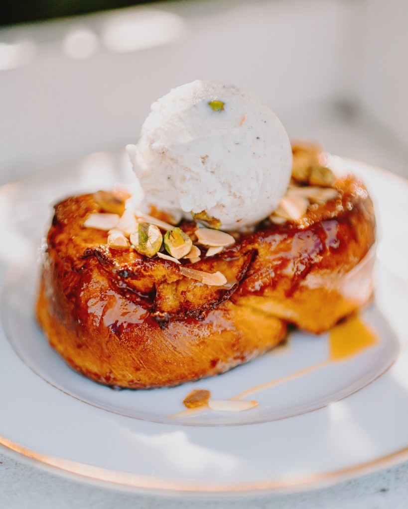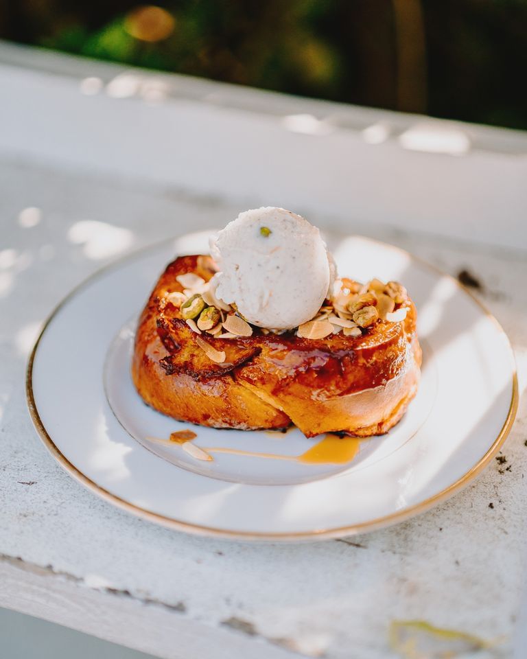 Venez déguster notre pain perdu moelleux avec sa boule de glace vanille et ses pistaches. ![]()