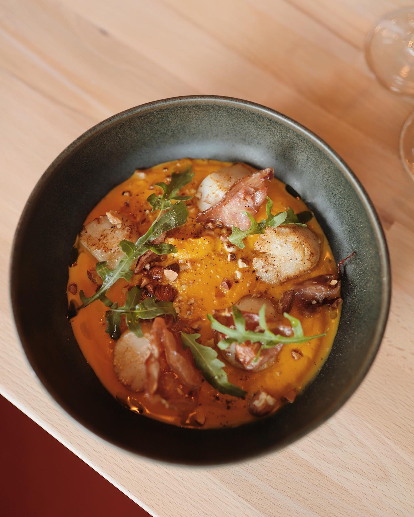 • SAINT JACQUES : Saint Jacques snackées, speck, crémeux de potimarron, amandes concassées torréfiées