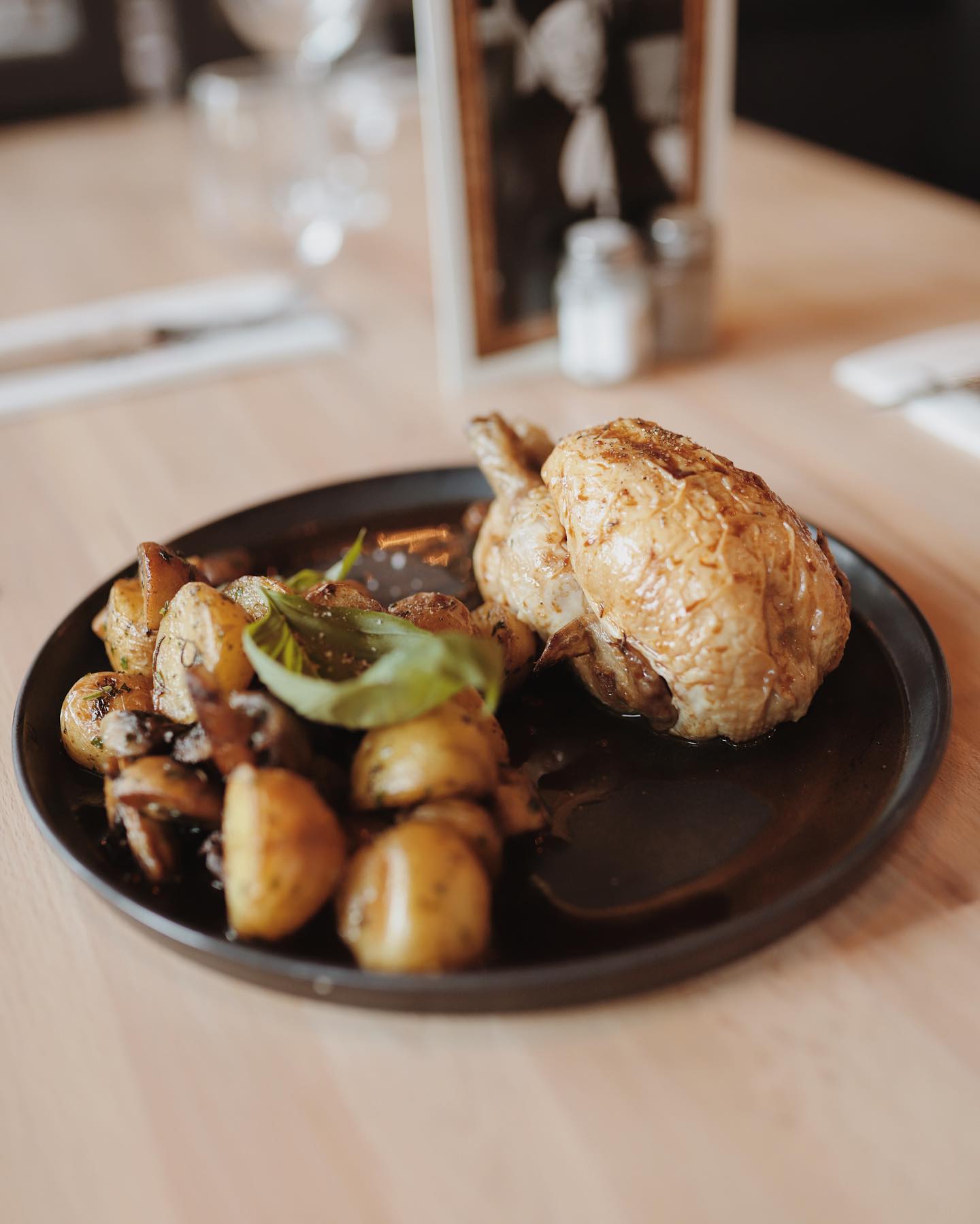 • COQUELET : Coquelet rôti sauce vin rouge, pommes de terre grenaille et champignons de Paris