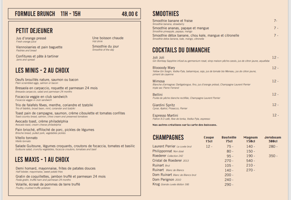 Service impeccable, personnel adorable et souriant, une formule complète et délicieuse tout cela sur le tempo chillé d’un dj set. que demandez de plus pour un dimanche matin… enfin midi.. bref, début d’aprem !
