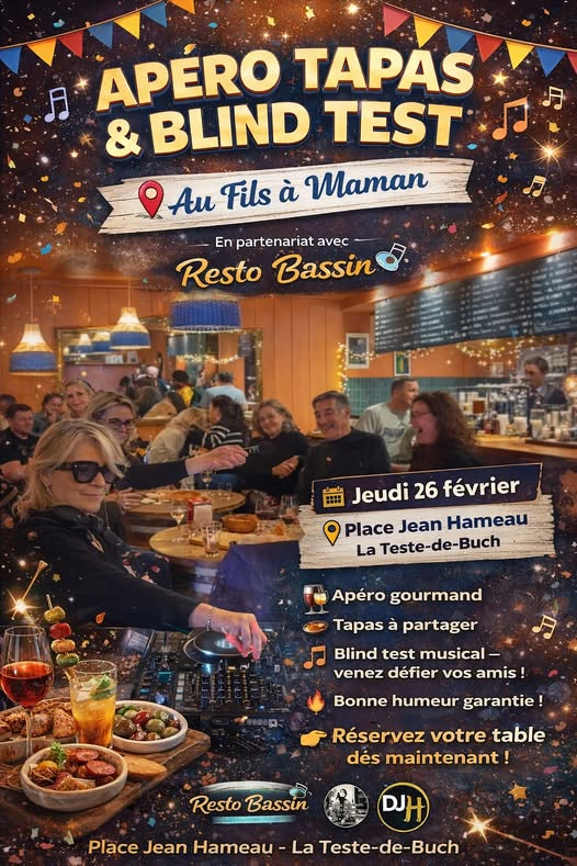 Restobassin, DJ H et Lefilsa Maman bar tapas place jean Hameau – la Teste organisent un petit jeu avec un tres joli lot gourmand à gagner pour tout consommateur, un petit verre.. une participation ! (Limitee a 1 par px) et ce, autour d’un blind Test animé par Hélène
